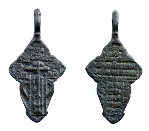Фото от поисковиков Москвы: крестик-листик, изготовленный, скорее всего, в 19-м веке. Такие кресты наиболее часто находятся при поиске с детектором, их массовое производство было налажено старообрядцами. В данном случае крест довольно заурядный, с непроливом, сохранился плохо. Форма для отливки была низкого качества, что сказалось отрицательным образом на внешнем виде тельника. Размер 38 х 20 мм.