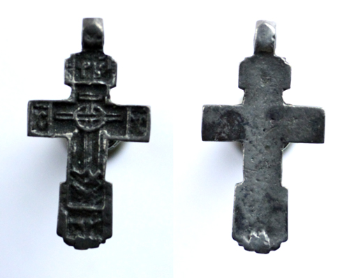 Небольшой крест из серебра относится к 14-16 векам и не так част в силу своего материала. Похожие крестики из медного сплава встречаются чаще, и они значительно крупнее. Изображение на кресте традиционно одностороннее. В перекрестии креста изображена Цата. Размер 33 х 12 мм.