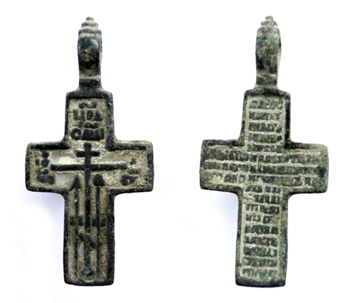 Приятный крестик мужского типа, характерный для 19-го столетия, с сохранившейся эмалью молочного цвета. Как правило, эмаль сильно страдает от пребывания предмета в земле, тут повреждения отсутствуют. Крест больше ничем выдающимся не отличается, обычная иконография. Размер 40 х 22 мм.