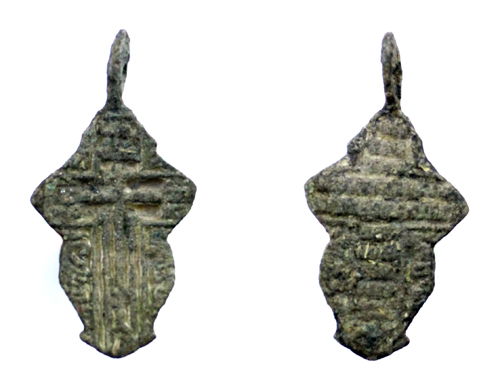 Этот маленький крестик, по всей видимости, принадлежал в 19-м веке ребенку, девочке. Сохранились остатки эмали, сама отливка довольно низкого качества и не воспроизводит качественного рельефа. Размер 30 х 15 мм.