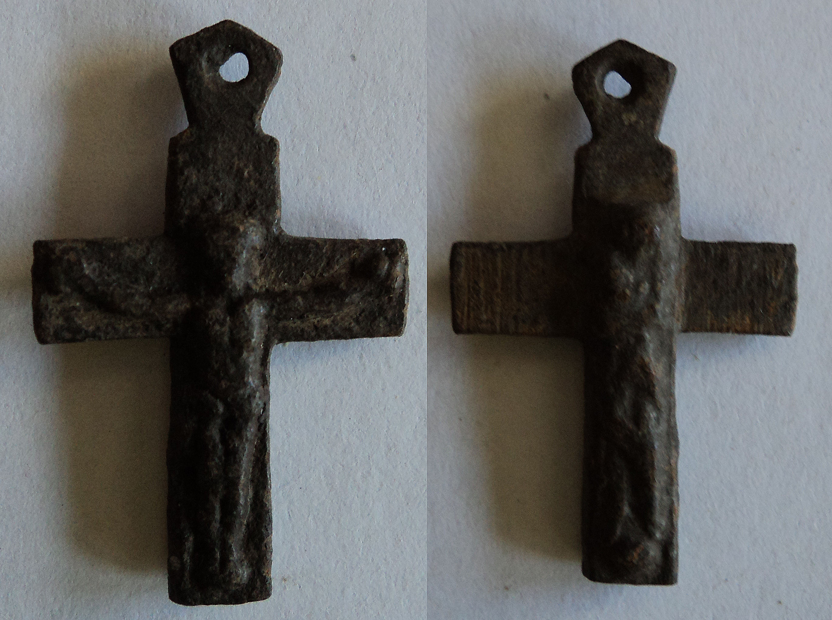 Характерный для католиков нательный крестик небольшого размера. На лицевой стороне - Распятие Христово, на обороте - ростовая фигура Богородицы на шаре.