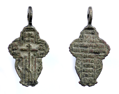 Женский крестик-листик небольшого размера сберег на своих сторонах эмаль кремового (?) цвета. Эмаль сохранила свой блеск и отливает перламутром. Сама форма крестика несколько приплюснутая, выполнена не столь искусно, как на некоторых других образчиках. 19 век.