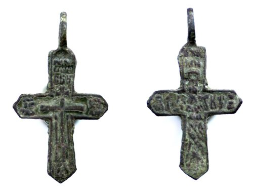 Кресты с изображением на оборотной стороне орудий Страстей Христовых, именуемые пассионалами, не так часты, как те, у которых на обороте воспроизведен текст молитвы "Да Воскреснет Бог!", а на этом малыше и рельеф сохранился и даже эмаль. Форма креста с заостренными сторонами также необычна. Размер 35 х 19 мм.