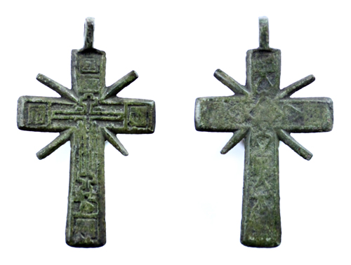 Красивая патина этого креста несколько скрывает рельеф, но вероятно также, что рельеф несколько затерт в процессе носки. На оборотной части крестика изображены орнаменты, личики полностью сохранились. Размер 44 х 26 мм.