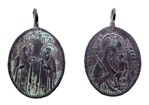 Штампованная иконка с изображением Почаевской иконы Божией Матери и двух старцев преподобных Антония и Феодосия Печерских (основателей Киево-Печерской Лавры) изготовлена была в 19 веке, или в начале 20-го века. Хорошо сохранился рельеф, что для таких тонких религиозных предметов явление редкое.