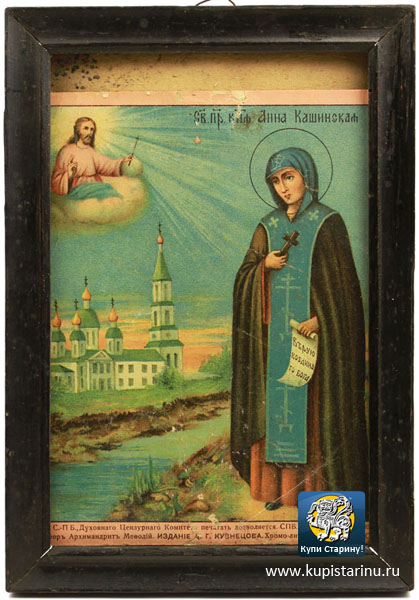 Еще одна старинная печатная икона - святая княгиня Анна Кашинская. История этой святой подробно описана в текстовом сопровождении иконы, но и само изображение примечательно тем, что было исполнено в издательстве А.Г. Кузнецова, а отпечатана икона в типографии В. Иванова и Ко, настоящий раритет!