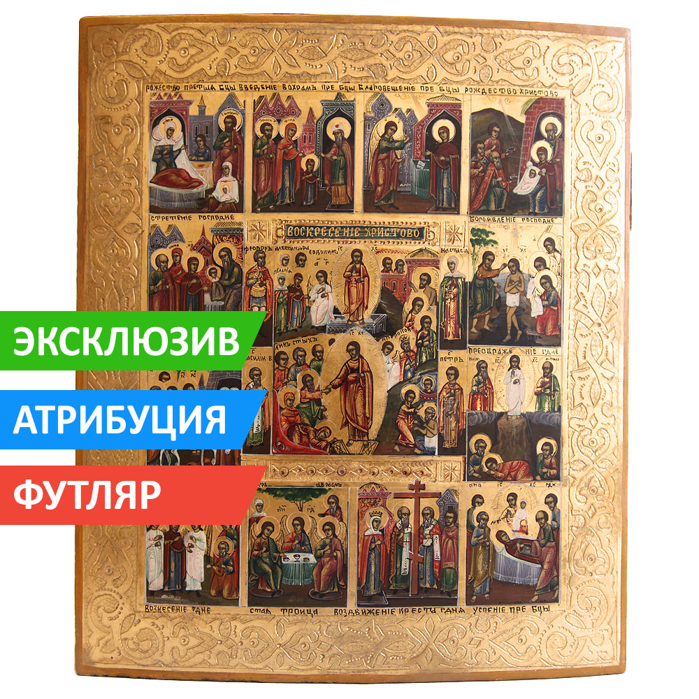А вот и Палех! Палехские иконы XIX века сегодня - редкость, это не секрет ни для кого. Но вот мы представляем Вам многочастную икону Воскресение Христово Сошествие Во ад с Двунадесятыми Праздниками - целый домашний иконостас и Церковный Календарь, иконописное произведение в тонком исполнении и отличной сохранности!