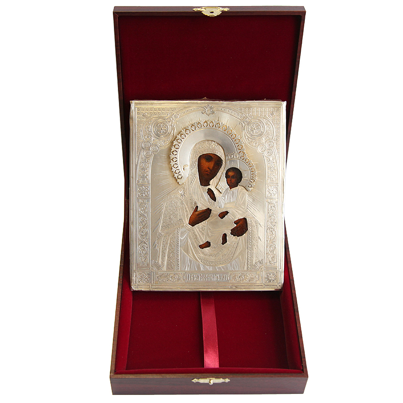 Важно заметить, что все иконы в серебряных окладах имеют в комплекте документ-Атрибуцию и отличный подарочный футляр, как, например, вот эта симпатичная Тихвинская икона Богоматери: