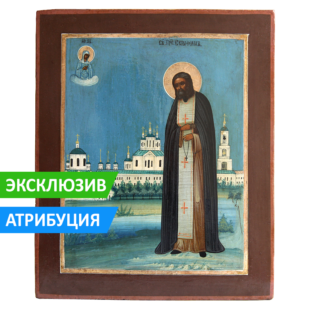 Впрочем, по редкости исполнения и по отличной, коллекционной степени сохранности образ преподобного Тихона может соперничать и с этой иконой преподобного Серафима Саровского, также написанной на доске аналойного размера и с архитектурными подробностями!