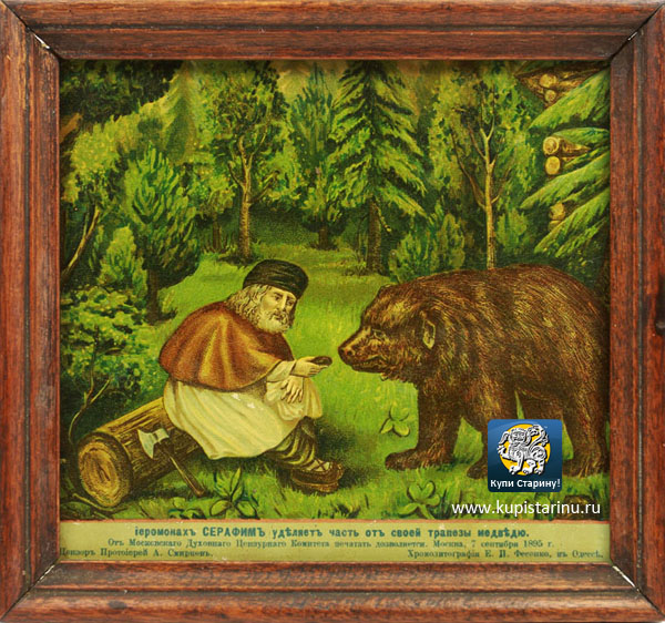 Печатные иконы могут быть не просто редкими, но и загадочными! Вот, например, изображение Иеромонаха Серафима (Саровского), протягивающего часть своей скудной трапезы дикому медведю. Выясняется, что это не совсем икона, или даже сказать, это не икона вовсе, вот только ей в XIX веке поклонялись точно также, как полноценной иконе и на печать этого изображения даже давала разрешение Церковная Цензура!
