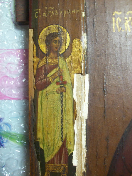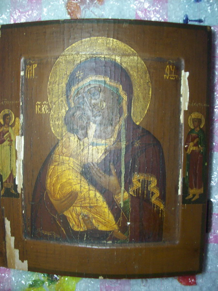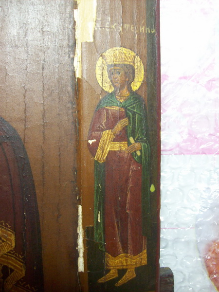 2.Икона Пр. Богоматери Владимирской с предстоящими Ангелом Хранителем и Св. Екатериной. Размер 31см-26см. Доска выгнута.