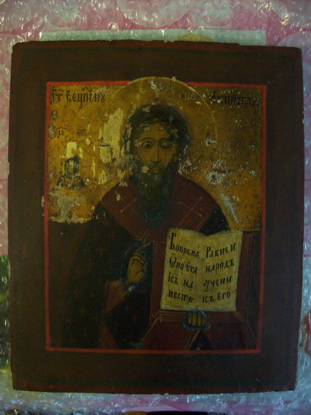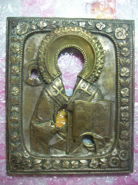 3.Св. Мч. Антипа. Размер 18см-14,5см. Прямая, оклад латунь с остатками серебрения, клейм нет.