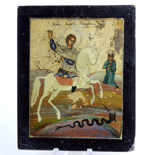 Интересно другое: на подобных иконах очень забавно бывает рассматривать змея, которого поражает славный святой, спасая принцессу от неминуемой гибели. На этой миниатюрной иконке змей выглядит, как большая черная гадюка, покорно принимающая в пасть острое копье всадника. Иконография упрощена до предела. Царевна есть, а вот традиционных палат, на фоне которых она обычно изображается, тут мы не видим.