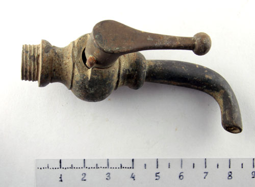 Вот такой краник. В принципе, он действующий, но от какой емкости он был - не понятно. Возможно, от питьевого бачка? Рукомойника? Сам краник выполнен из латуни, фрагментами проглядывает серебристое покрытие.