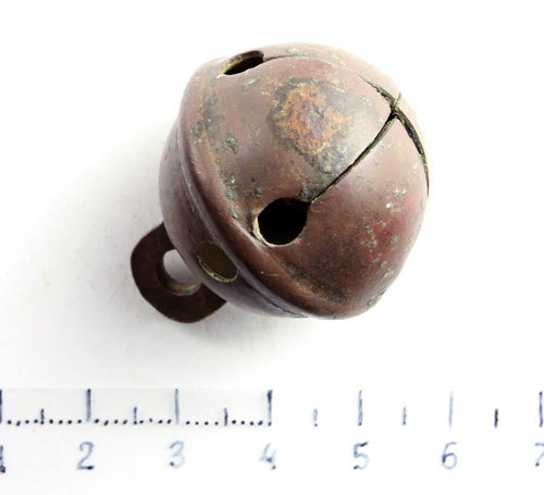 Классический бубенчик, который не только сохранил свою форму, но и реально звонит. Комплекс из таких колокольчиков вешался на конскую сбрую, ну а под дугой висел большой (поддужный) колокольчик, звон которого задавал тон звуковому сопровождению бубенчиков...