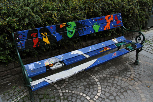 Перед посадкой в троллейбус, в потемках какого-то закутка фотографирую заключительную достопримечательность – уникальную скамейку с росписью. Что хотел сказать мастер скамейкописец, понять сложно, но выглядит сочно и нарядно!