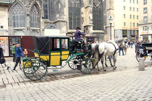В Вене много конных повозок, обслуживающих туристов. Лошадки красивые, хотя и пахнут вполне аутентично. У них предусмотрены специальные «подпопники», в которые укладывается навоз, так что опасности вляпаться в душистую кучу у зазевавшегося фотографа в Вене нет.