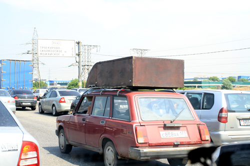 Вот сколько наблюдаю за автовладельцами, столько удивляюсь... Бывают экзотики такие, что волосы дыбом и глаза на выкате становятся при виде их выкрутасов. Недавно попали с супругой в обычную МКАДовскую пробку, и надо же, нашли, как время скоротать - увидели странное сооружение на крыше одной из легковушек. Сначала подумали, что пенсионер следует маршрутом на дачу, но внимательно присмотревшись, поняли, что это не дачник, а... настоящий находчивый автотурист! Хотя, может быть, это и не автотурист, а таксист, желающий гарантировать пассажирам чистоту и сухость их драгоценного багажа? В любом случае, папаша постарался на славу: фанерная махина, высотою в полметра, а то и больше, накрывает своей зловещей тенью всю крышу машины. Характерные петли и замки венчают боковую дверцу. Новомодный скошенный перед фанерного туристического багажника обеспечивает "превосходную" аэродинамику... хотя, какая на хрен, аэродинамика у этого топором срубленного, автомобиля?