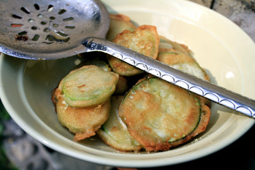 Казан разогреваем и на дно наливаем немного масла. Кружочки кабачков вываливаем в кляре и выкладываем на дно казана, они должны жариться в масле, вот так: