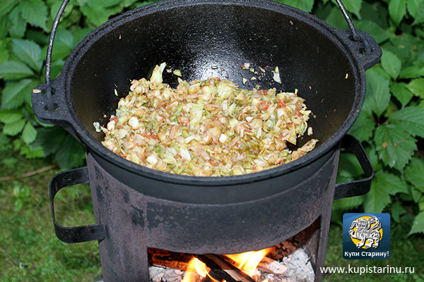 Неделю назад я привез на дачу кочан капусты и подумал, а что с ним делать? И тут мысль меня посетила - а не зафигачить ли из нее тушеный вариант, да еще и в казане? Сказано - сделано!