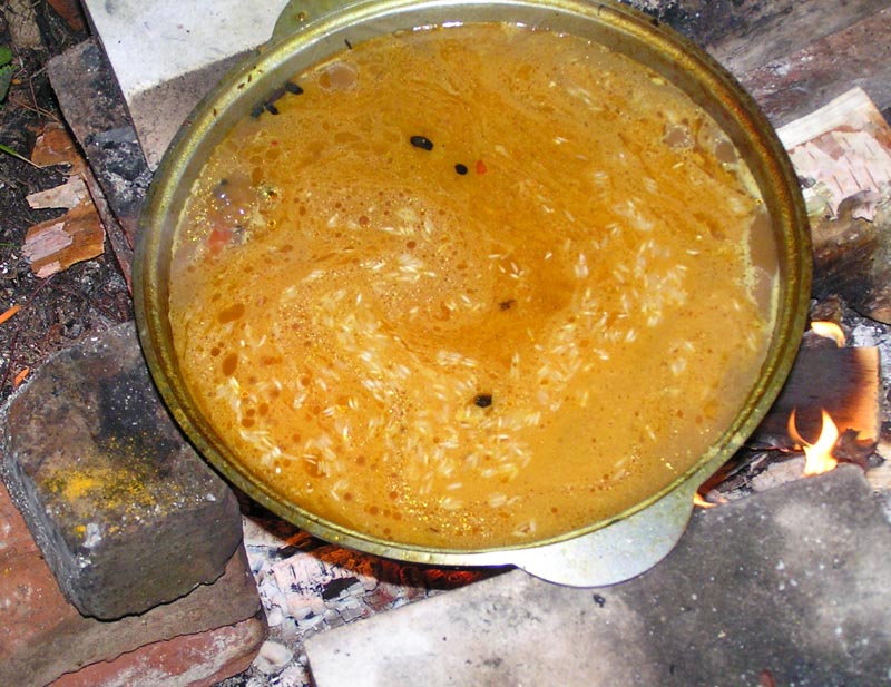 После того как это вновь закипит, уменьшаем огонь до минимального, в последний раз пробуем соль. Ждем, когда рис разбухнет и уйдет вода. Попутно на углях можно приготовить легкую закуску… ;) :roll: :D