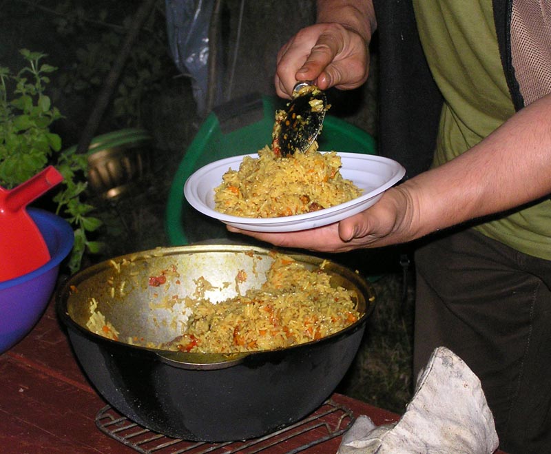 Подсмотрел, когда некоторое время жил у знакомых в Узбекистане. :roll: Так что основа – классический узбекский плов, плюс свои небольшие доработки. А после плова, ну или на утро, очень рекомендую испить чай из самовара, разогретого на березовых щепках и сосновых шишках!!!