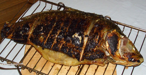 Для этого нужен гриль и нужна рыба. Рыба при этом нужна большая, свежая и речная. Тут не помню, что было, лещ, чтоль...