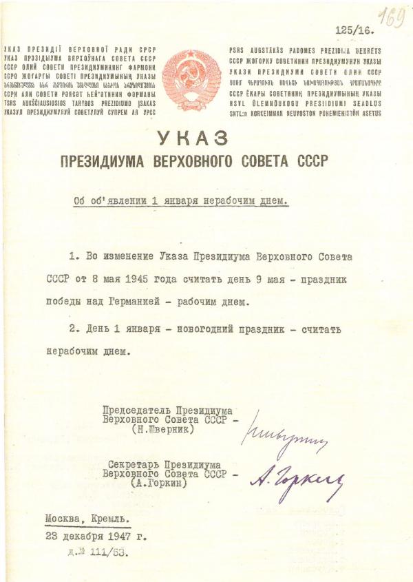 Однако уже в декабре 1947 года празднование Дня Победы было отменено, и тем же указом этот выходной день был перенесён на Новый год (напомню, с 1930 по 1947 год 1-е января считался рабочим днём). Так что, первое января, в какой-то мере, можно считать и Днём Победы!