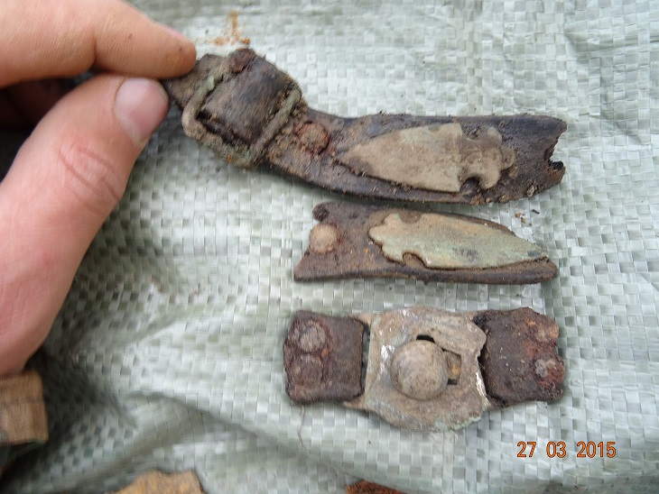 Мы предположили что он поясной,хотя с бойцом находились фрагменты командирской планшетки..может и от него.Но узоры???явно не уставные.