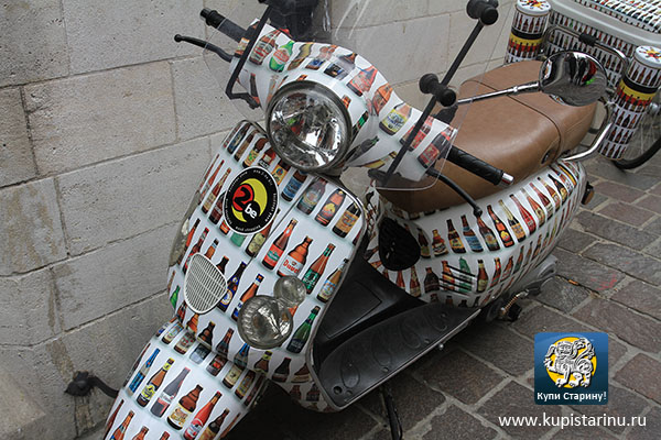 После прибытия моих мореходов, мы пошли дальше, и попали туда, куда должны были – на улицу, на которой располагаются фетиш магазины шоколада и самый известный магазин пива. Поскольку с пивом мы в этот день друзьями не были, я лишь мельком зашел в сам магазин (скажу честно, он мне не понравился), и сумел сделать всего один снимок. Этот кадр запечатлел визитную карточку магазина пива «2бе» - мотороллер, уклеенный изображениями пивных бутылок. Если увидите его в Брюгге, знайте, что пиво где-то рядом! А чо, я бы такой мотопед хотел!